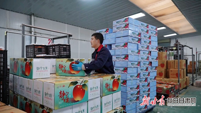 在陇原红分选加工车间,全自动智能分选线高速运转,红彤彤的静宁苹果依次经过清洗、分拣、分级、包装等工序。该生产线可对苹果的重量、果面、颜色、糖度、瑕疵等指标进行精准检测分选,实现果品标准化、智能化分级,有效提升产品品质与市场竞争力。工人们各司其职,熟练进行套网、装箱、码垛等作业,一箱箱优质苹果即将发往全国各地商超及市场。
